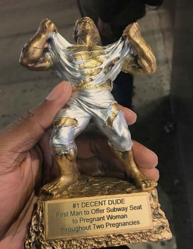 Dicha estatuilla media aproximadamente 17 cm, seria creada de bronce y tendría una escultura similar a la de hulk. En la placa tenía un mensaje que decía lo siguiente: “Primer chico decente. Al primer hombre que cede su asiento en el tren a una mujer en su segundo embarazo”.